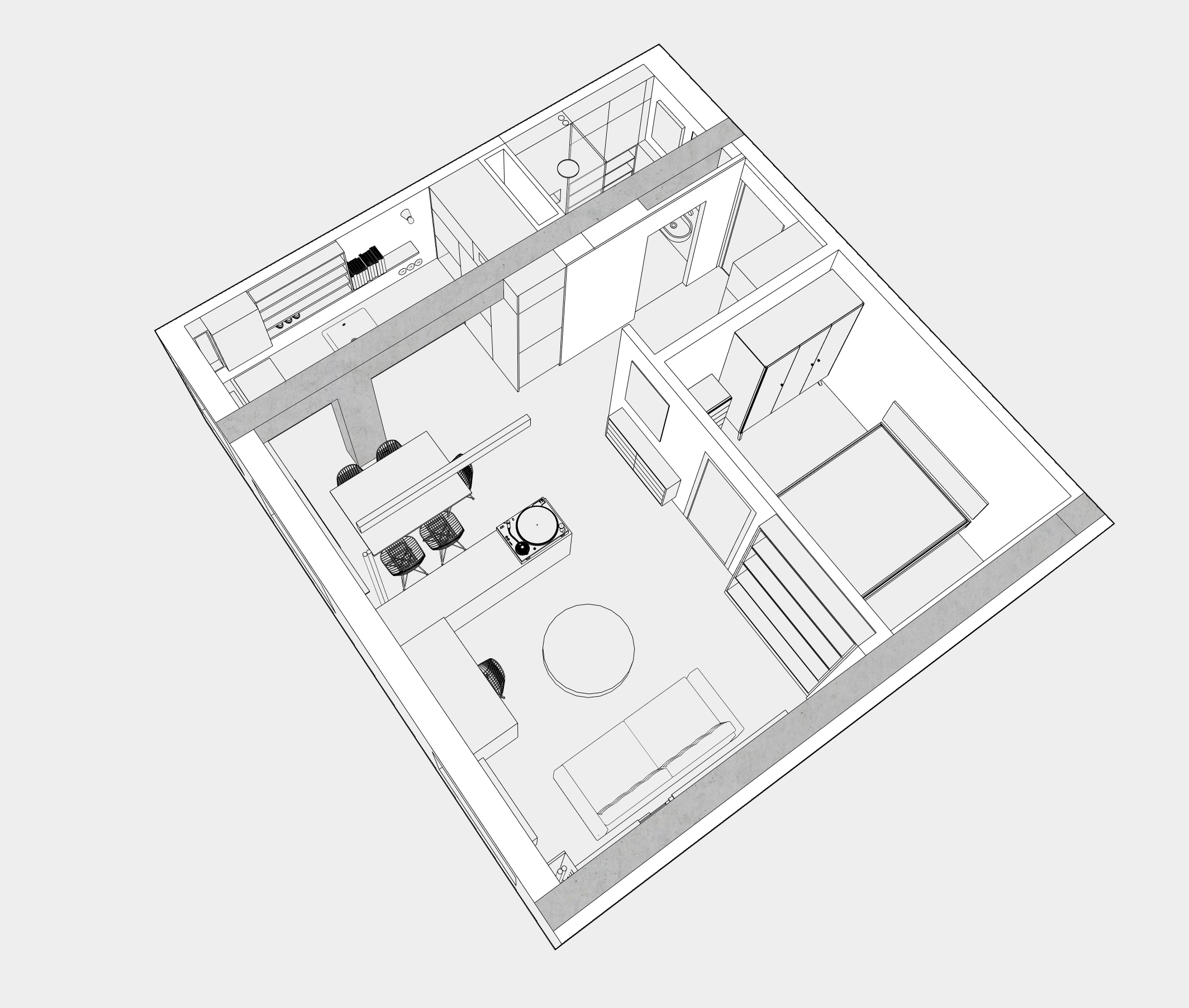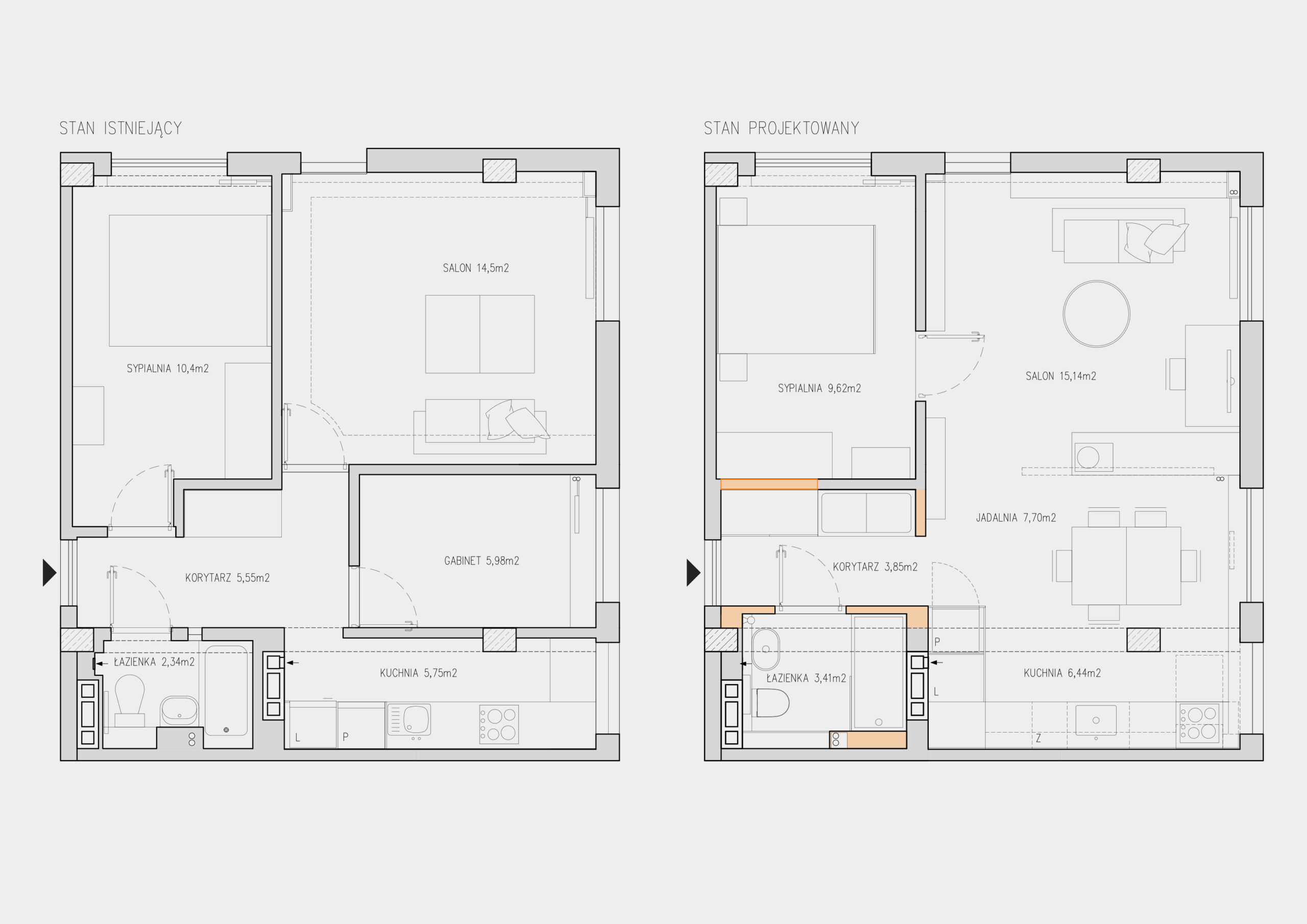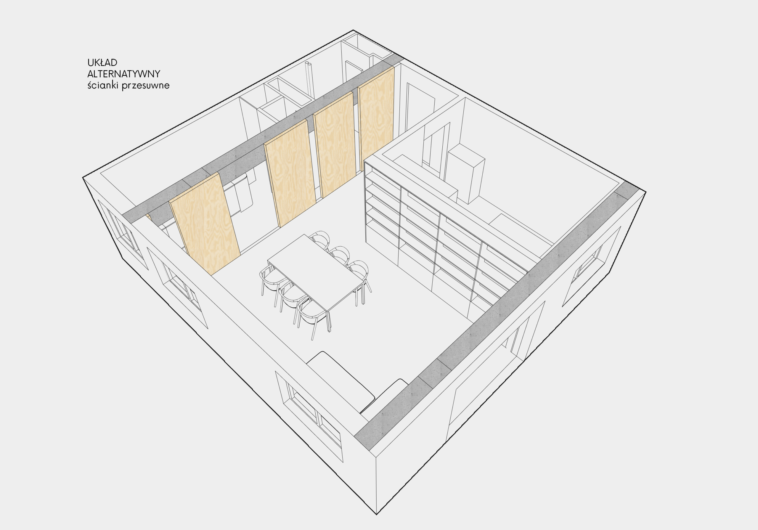 Prosta konstrukcja, pomimo swoich ograniczeń- niskich wysokości pomieszczeń, pozwoliła na całkowita zmianę aranżacji, powiększenie łazienki i dopasowanie układu do wymagań inwestora.